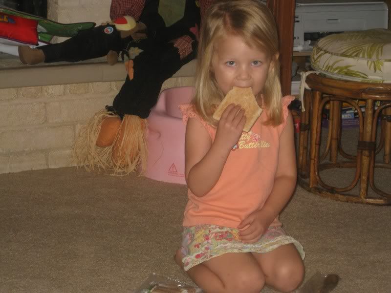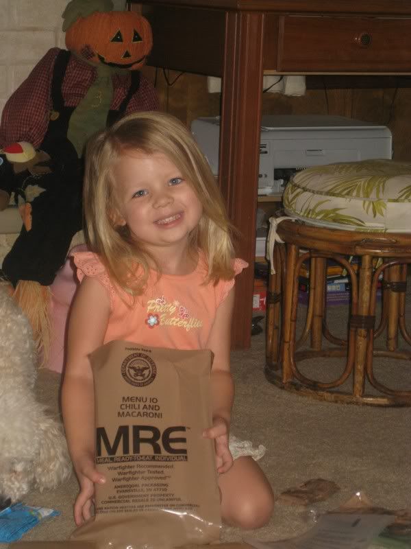 Brad brought home a few MRE's leftover from the hurricane cleanup stuff the other day. He totally pumped Brooke up for a "picnic" with an MRE for the last few days. She thought it would be the coolest thing ever and has been BEGGING to eat an MRE (meals-ready-to-eat) ever since. So tonight they had their living room floor picnic with the MRE.