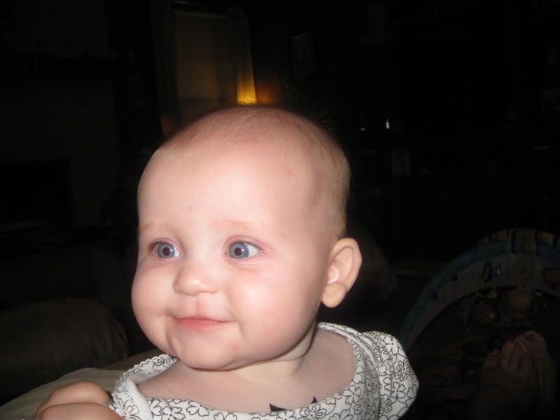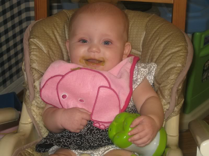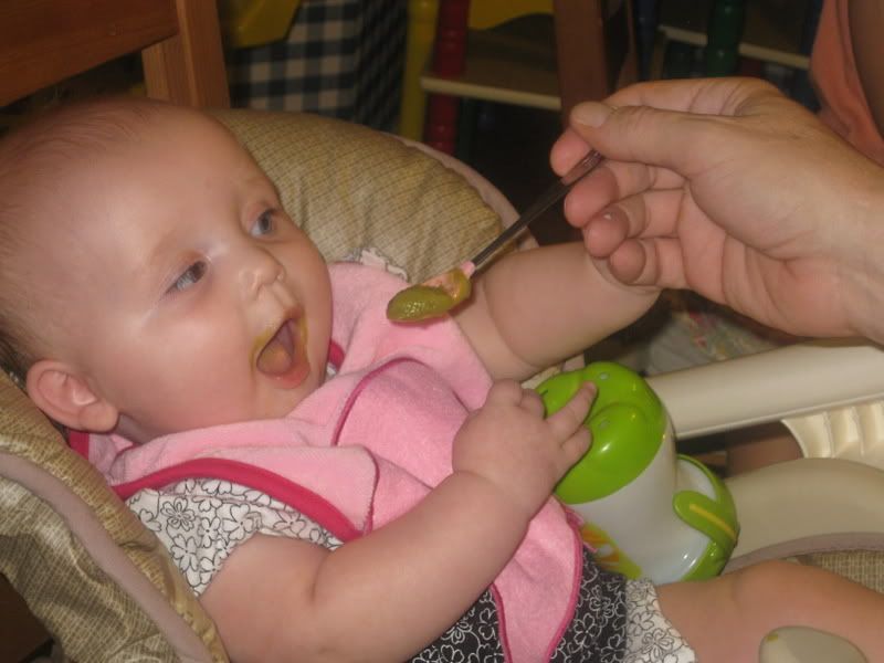 And on another note, Brenna got a new food tonight. Peas! And she LOOOOOOVES them. Definitely must've been a bad choice with the carrots, because we could not keep the peas away. She never got this excited over the carrots that's for sure. :) She was reaching and grabbing for the spoon trying to guide it into her mouth. She ate the whole jar, plus a bowl of cereal. This kid can eat!