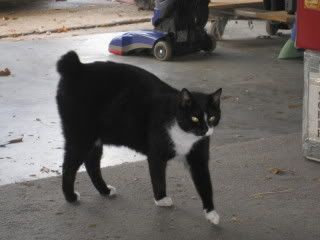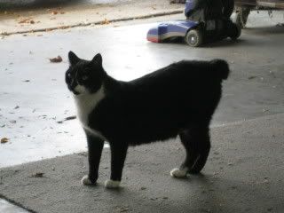 For those of you who have been to our house, no, this isn't a new cat. We rescued this kitty (literally!) from the drainage ditch by our house when he was about 4 wks old....that was about 5 years ago. He started out in our yard, then our porch (when the weather was bad), then the garage and now he even has a little cat door going to and from the garage, a table specifically for his food and water, and a comfy chair to sleep in. :-) Brad has always been a sucker for animals. And I was the one who 'found' him and just couldn't let him starve. :P When he was a wee tiny kitty, a nice vet student from around the corner fell in love with him as well and had him vaccinated and fixed for free. So, five years later, he is a domesticated cat still living in our garage protecting our home from vicious birds and mice.
