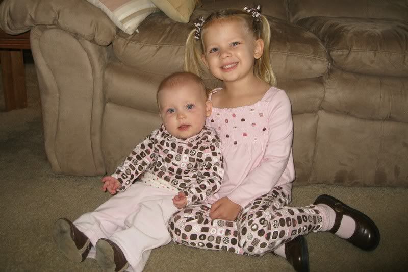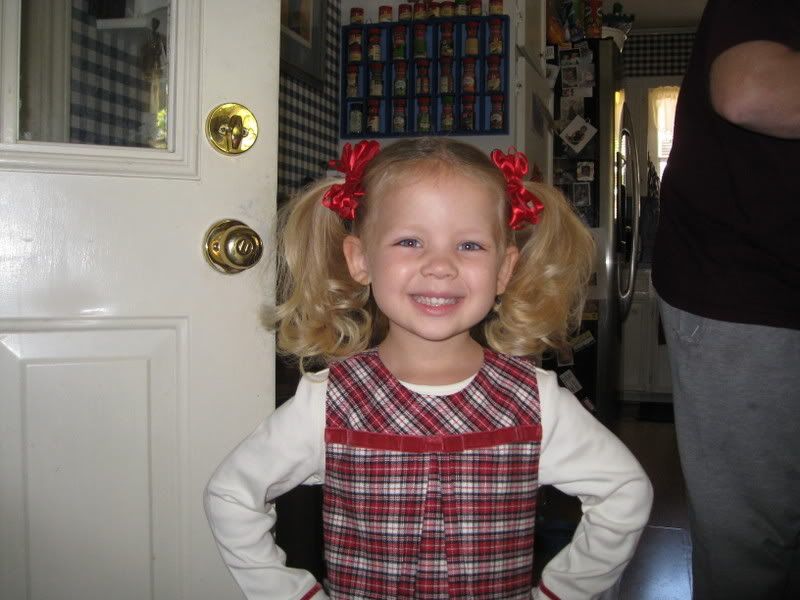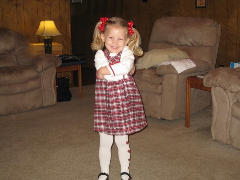 Hey! Don't go calling the SIDS police on me. I put Brenna on her back to sleep every single time. And the immediate second I put her down, she rolls on her tummy to sleep away. What else can I do? She is pretty cute though isn't she? : )And here's Brooke before we went to take pictures with Santa. Yes, you read that right. Pictures with Santa. On November 8. LOL! The photographer does them early enough so you can get the pictures back in time to send out for Christmas if you desire. Anyway, the hard part is finding matching or coordinating outfits that early in the 'season'. But here's what it was. And Brenna had the same. I only took a picture though, b/c Brooke was so stinkin cute! With her pigtails that I had curled. I had to get a pic in case it didn't last. And of course, you know I'll be posting the Santa pics as soon as I get them. :D But for the record, it had to be the fastest photo shoot in history. Seriously. Both girls literally got up there, smiled for several pictures together and individually. We got out of our car at 11:30 on the dot and were getting back into the car before 11:45! Neither were scared, skittish, or grumpy. You'd think they were born to model or something? Quite a change from our years before.... Even the photographer commented that she had never had any so easy! YAY! I can't wait to see the pictures - I know there are some really good ones! And if you are interested, I was blogging last year at this time and here's the link to our previous Santa picture experiences - click here for the pictures! (back when the curls in her pigtails were still from that baby hair curls) And click here for the stories!
