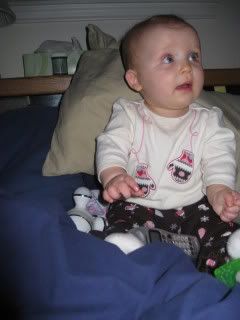 As, in sign language! For some time, Brenna has definitely understood what we were saying/signing to her. But the last few days, I could have SWORN she was doing the sign for "milk" and "more", for milk obviously and for more puffs (the finger foods). Well, today, was pretty definite. She was looking right at me, doing "milk", and kinda starting to get fussy. It was really obvious. Then I asked her, "Do you want 'milk'?" and she got all excited and tried to reach out for me. I know she was signing it. So, of course, in my true fashion, I got a picture of it later. Notice her left hand doing 'milk'.