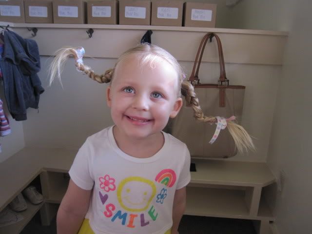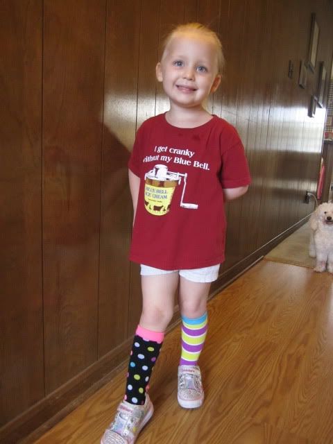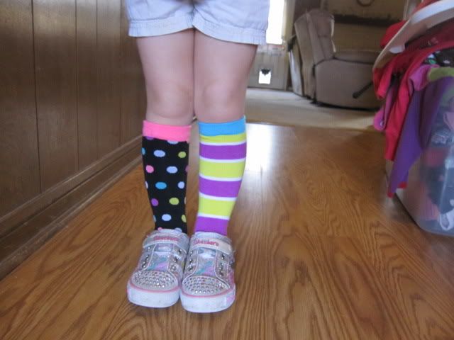 Brenna had "crazy" week at her school last week. One day (she missed) was Crazy Hat Day, then they had Crazy Hair Day and Crazy Sock Day, and lastly Crazy About Your School Day (where you wear your school shirt). Here's how she participated. :)