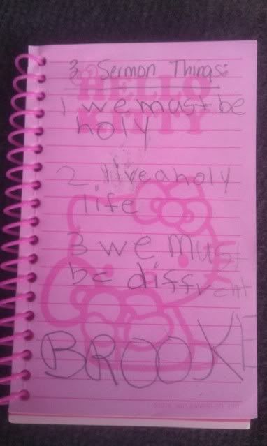 Now that Brooke's getting older, capable of doing more than just coloring in church... I've had her really participating in church. She follows along the order of the service, singing most songs, reading out most parts that the congregation does, and she's said the Lord's Prayer for a long while now. But most recently, I've also had her start REALLY listening to the sermon too! At our church, they do have a "children's time", where the kids come down to the front for their short little spiel on whatever the gospel reading was about and they (the Pastor sometimes or the Director of Children's Education) relay a short (very short) message about it. But now, she is also required to listen and pay attention the Pastor's sermon each week. And to ensure she gets something out of it, I've had her make a list of 3 things she hears in the sermon that she thinks is important. This past week, this was her list. :)