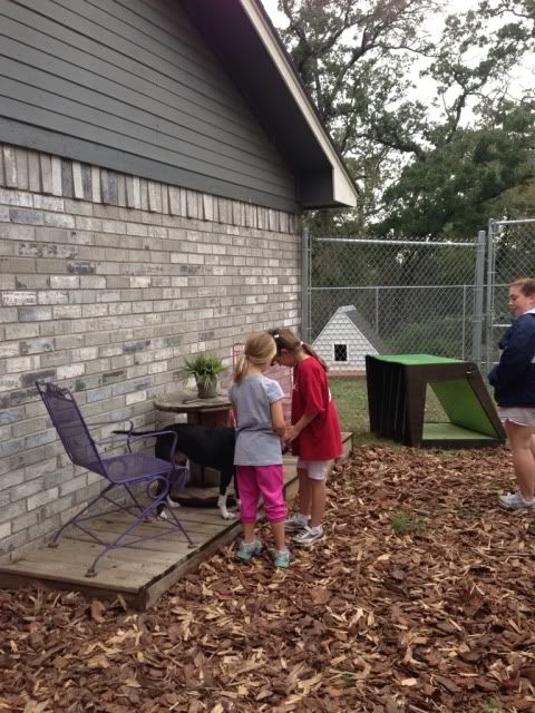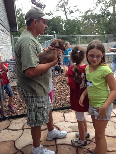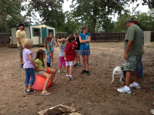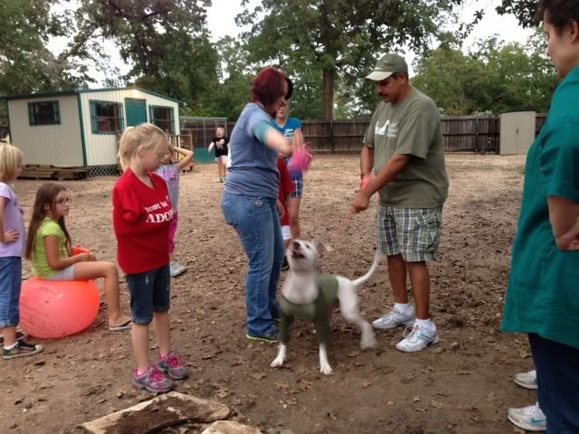 And this sweet dog (below) was actually featured on our local news a while back. Someone had literally set this dog ON FIRE!!! Yes. The dog was set. on. fire. And left in a parking lot. Some nice passerby stopped, put the fire out and took the dog to the vet. The vet's office fixed the dog up and this shelter took care of the dog from there foreward. The dog today is totally fine, except she must wear a 'shirt' at all times because of her scars/burn marks. :( She is a bouncing bundle of joy that was so great with the kids, excited to play. Seriously, she was so fast and excited with all the kids around, I could barely get her in a picture..as she didn't stand still for longer than a tenth of a second! Haha! :)