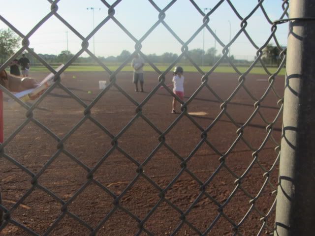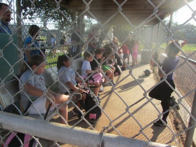 This season, however, she did move up to the "big leagues"...haha! Ok, that is totally my term. But before she was on the 6U (6 and under league), now she's in 8U (8 and under). Which means no more teeball. Its all coach pitch. 3 strikes and all that. She had to go through evaluations (which I thought I posted about but maybe not)....which basically was like the draft. Serious! All the girls had to go out, hit a few balls, throw some, field and catch. The coaches stood around, made notes and then they had a 'draft' or picking teams anyway. Brooke did pretty good - especially considering this was her first time doing that, being put on show...AND! She was the VERY first one they called out. Poor thing. :P