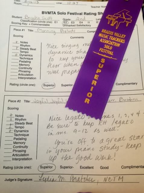 Brooke played at her annual Solo Festival a couple of weekends ago. (one of those very busy Saturdays...) Its where she had to have two pieces memorized, play them for a judge and get a rating. As per typical Brooke style, giving me and her piano instructor gray hair...she froze the week before. Could not play through either one. And then, day of the competition, she aces it and receives a superior rating (the highest you can get). Yay Brooke!