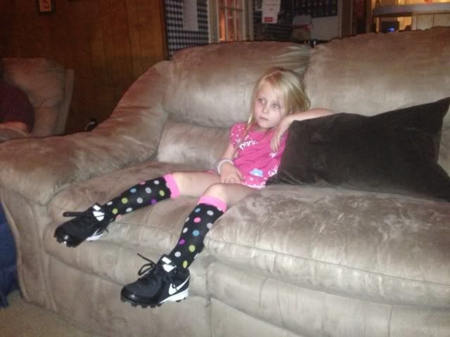 Meanwhile, we took the jump and went ahead and signed Brenna up this year. She really wants to play and is technically supposed to be 5 as of Jan1. (she'll turn 5 at the end of April..end of softball season) But...eh...they'll take our money I'm sure. I just hope she's not in over her head and ends up on a team with all 'big' kids. Hopefully most of the girls on her team will be 5 instead of big 6 yr olds (Its 6 and under in her league) She did not have to go to evals (for the 6U team) but we did outfit her with Brooke's old glove and bat and got her her own pair of cleats (Brooke's old ones are still too big). She was sooooooo in love with her new cleats, she literally wanted to wear them everywhere - even to bed.