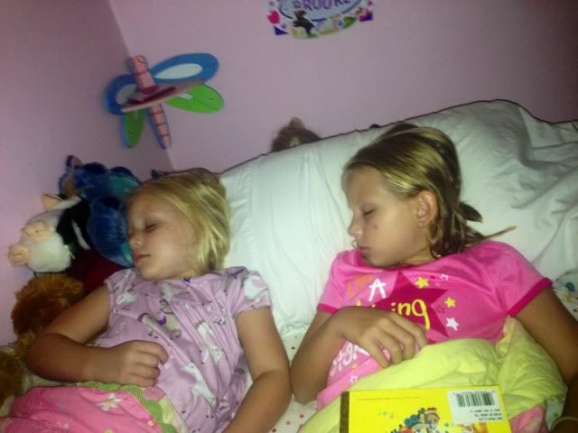 Eeek! So incredibly sweet, isn't it? So now, panic moment over, I rush to get my camera. I love it. I love love love this picture. I love that they fell asleep together, reading a book and look like twins! Sleeping the same way, the same direction, arms in the same place, same profile. Gosh, I love these girls. *sniff sniff* (good cry, good cry...haha!)