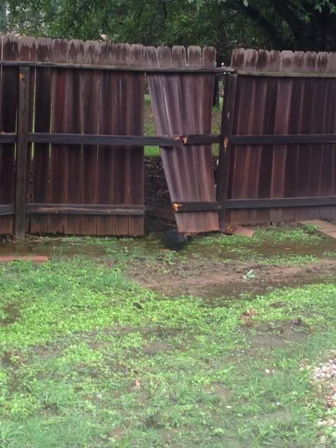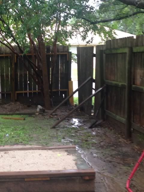 We've had quite a bit of rain lately! Seems like its non stop at least every other day if not every day. Seriously! Anyway, the first one that kicked off the season (exactly four days after we put the deck sealant down - whew!) was QUITE a storm. People all over town lost trampolines, had damage, flooding, etc. Some speculated a tornado came through but it was just really high crazy winds. So we are thankful that everything at our house was mostly ok. Our only damage was to our already pathetic fence. So more to fix there (one day)...